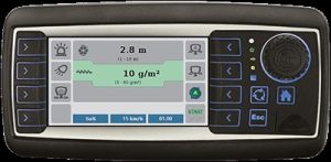 Controlerul vă permite să vă personalizați sesiunea de răspândire în funcție de situația dvs.de lucru. Controlul automat al vitezei GPS ajustează cantitatea de material de împrăștiat (g/m² sau ml/m²) în funcție de viteza vehiculului dvs., în timp ce modul manual vă permite să introduceți o viteză fixă a melcului. Controlerul colectează și salvează în plus datele esențiale pe o memorie USB, permițându-vă să generați rapoarte de răspândire. Controlerul facilitează, de asemenea, pornirea funcțiilor, cum ar fi vibratorul, farul și lumina de lucru, din interiorul cabinei.