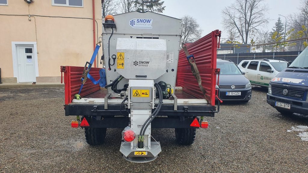 Motor auxiliar diesel sau benzină pentru funcționare independentă, dizpozitiv GPS și tahimetric pentru împrăștiere automată, prelata din PVC, indicator rutier obligatoriu „ține stânga” cu săgeată, kit de împrăștiere asimetric controlat de la panou, senzor de nivel scăzut de sare cu lampa de avertizare pe panou de control, vibrator extern comandat de la panoul de control, picioare de parcare cu manivela, kit de fixare pe autovehicul, lumina de lucru rosie.